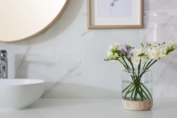 Plants like peace lilies, aloe vera, and bamboo help purify the air. A small vase of fresh flowers can also instantly elevate the scent and look.